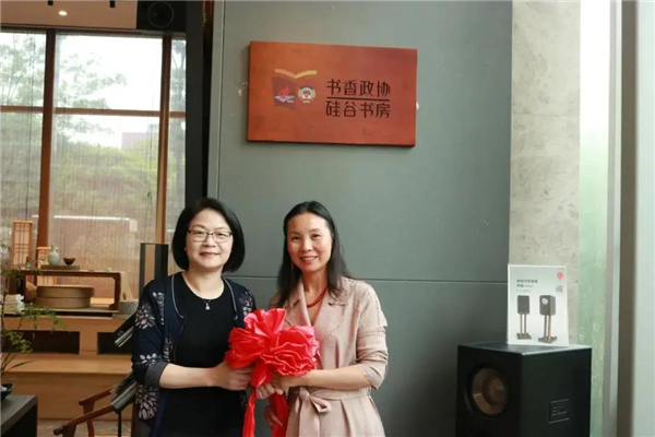 区政协主席王国珍和书房管理者、区政协委员林镜为“硅谷书房”揭牌,区政协领导和相关专委会负责人、部分区政协委员为书房赠书。