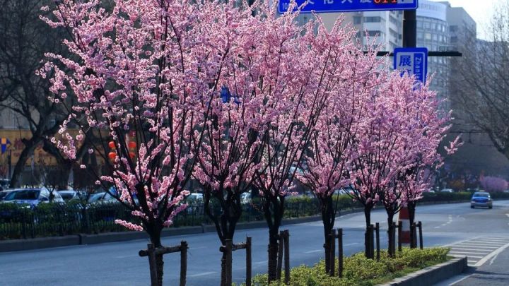 在杭州,美人梅种在许多道路的中分带和路边。比如古墩路的“古墩粉”,临丁路上更是有上百株美人梅。