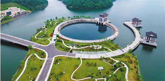 日前,2021—2022年度中国水利工程优质(大禹)奖评选结果揭晓,杭州第二水源千岛湖配水工程榜上有名,这是全国水利行业优质工程的最高奖。图为5月10日从空中俯瞰位于杭州闲林水库的千岛湖配水工程碗状配水井。