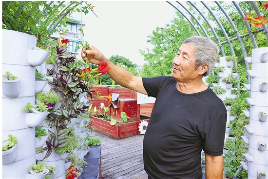 沈刘东说,华景北苑的居民大多都是从景芳村搬进楼房里的,却还保留着农耕情结,生态基地为大家留下了一块“老底子记忆”:“这里的花都是居民自发养的,现在有300多盆了,尤其是蒋师傅,从家里移栽了上百种花过来,光月季就有40多种,邻居们想养哪一种花,蒋师傅还会教他们育苗、扦插。”