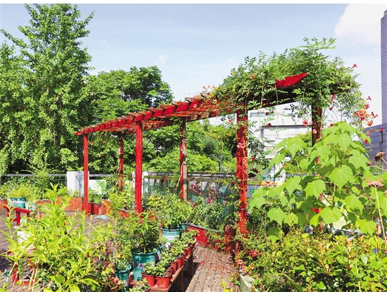 要说老邻居们感情最深的,还属“蔬语花香生态基地”。记者跟随蒋金根乘坐电梯到露台,映入眼帘的是一座超过100平方米的露天花园。