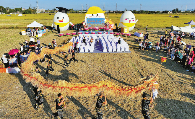 近日,“沐禾前溪·垄上金黄”余杭区径山镇前溪村丰收节在满目金黄的稻田间开启,集品牌特产、非遗文创、休闲美食等于一体的沐禾丰收市集让游客沉浸式体验乡村特色的农文旅产品;玉米棒接力、南瓜保龄球、大鹅套圈、稻田拔河、割稻子等乡间农趣活动让村民和游客一起感受丰收喜悦。