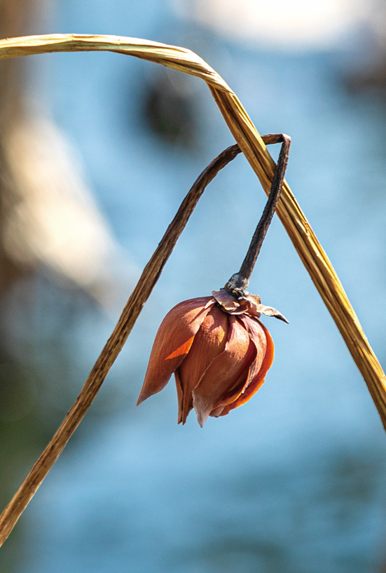 而北山街新新饭店公交站旁的“北街梦寻”荷区,这里的残荷却与众不同。虽然也已枯黄,但干枯的荷叶,依然在寒风中挺立,与其他只剩光秃秃荷梗的荷塘形成鲜明对比。靠近仔细观察,一些荷叶还残存着绿色。更神奇的是,残荷之间,竟然还能看到一些枯萎的荷花花苞,露出粉红色的花瓣。