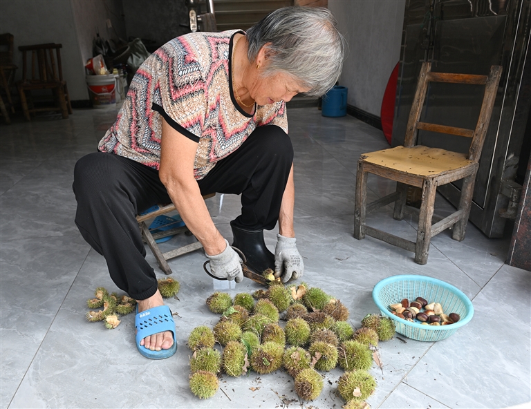 不远处的板栗林里,成熟的板栗纷纷裂开外壳,露出饱满的果实,等待着人们去收获这份秋日的馈赠。