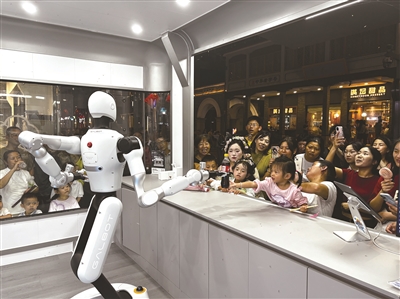 来自河南的小张和小王是湖滨银河太空舱工作人员。小张说,这家店9月24日开业,半个月以来顾客很多,经常围满,很多人特意赶来打卡拍照。国庆期间,机器人一天卖四五百瓶水、十几杯咖啡,2.5元一瓶的怡宝矿泉水一天卖200多瓶。