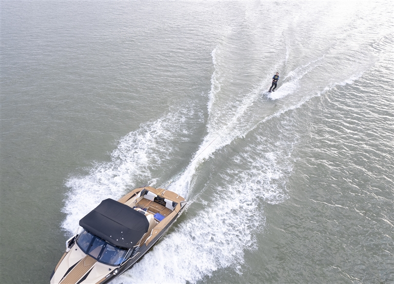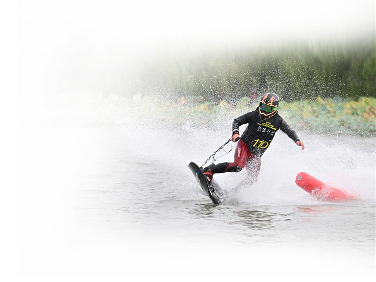 滑水项目精彩绝伦,选手们借助船尾激起的浪花,于波峰浪谷间灵活穿梭,尽显高超平衡技巧。