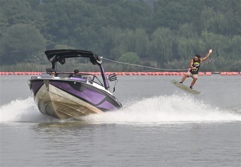 尾波滑水之际,他们脚踏滑水板,随船破浪前行,姿态轻盈且充满力量;回旋项目中,选手精准操控,在水面划出优美弧线;花样滑水更是惊艳四座,各种高难度动作令人目不暇接。