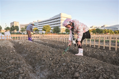 一位来自大连的大姐正在地里种韭菜,韭菜苗是网上买的,地里还种了菜园提供的小青菜苗,大姐看着菜地十分开心,“没想到种的菜全都活了!明年这一大片应该很好看。”