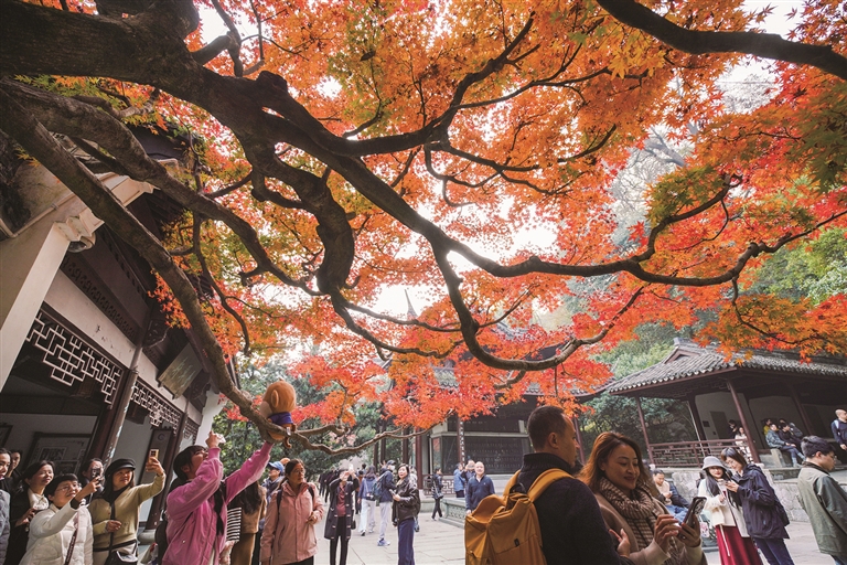 杭州虎跑公园里,有一棵“红枫王”,每年秋冬都红得似火。最近,杭州天气不错,这棵“红枫王”迎来最佳观赏期,树下围满来自五湖四海的摄影爱好者。它位于“虎跑梦泉”碑亭附近,标志性的大茶壶雕塑旁。站到树下,树干向四周舒展,犹如一柄巨大的红叶伞,美不胜收。