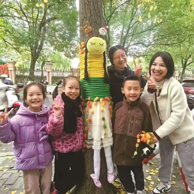“我们在校内校外选了18棵树,18个班级每个班认领一棵树,由老师、家长和小朋友一起出点子:你想怎么样打扮这棵树?鼓励孩子们发挥艺术想象力,在色彩、纹理、编织手法上大胆创新,让每件‘树衣’都成为独特的校园景观。