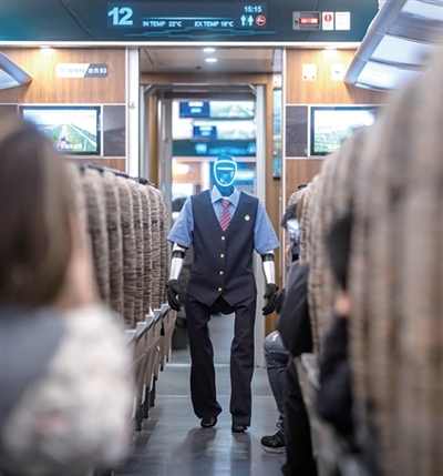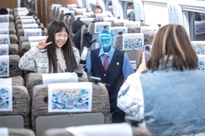 机器人乘务员“福兴”在“西子号”列车上与旅客互动。