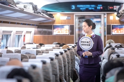 列车员拿着“保持安静”的提示牌在静音车厢内巡视提醒。