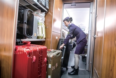 这几天旅客多,行李也多,为了不影响过道通行,每当发车后,列车员们第一时间要把大大小小的行李箱摆放到合适的位置。