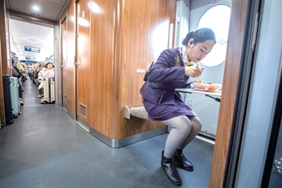 一路上,列车员都在各自负责的车厢忙碌,巡视、查票、答疑,列车到站前,还要在车门立岗处目迎进站,做好旅客引导。只有轮流吃饭的时候,才有空坐下来,这时已经下午两点半。