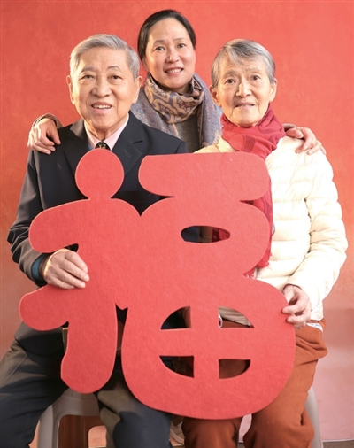 林崇渭今年85岁,和爱人一起住在长乐老年公寓。女儿林霄听说要拍全家福,中午就从家里特意赶了过来。林崇渭很喜欢收藏照片,从1952年到现在,他存了200多张重要照片,为自己做了4本影集。为了拍出好看的照片,他一早换上了藏青色西服套装,打上领带,把头发吹得蓬松。拍摄时,一家三口拿了一张大大的“福”做道具。林霄高兴地说,“这是我们2026年的第一张全家福”。