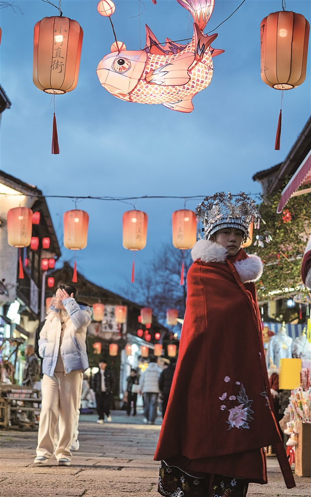 今天是元宵节,迎龙灯、猜灯谜、赏花灯、守财神、逛市集、吃汤圆,杭城充满了节日的气氛。当圆月爬上运河边的屋檐,当花灯点亮古街的青石板,小河直街已备好满满的仪式感——特色鱼灯、灯谜待解、河灯祈愿……从午后到夜晚,等你来赴这场江南新春的圆满之约。图为昨日,小河直街张灯结彩,节日氛围浓厚。