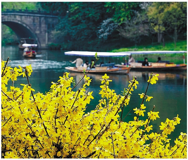 春分已过,清明将至,西湖湖西的乌龟潭景区满目翠绿,水岸边的樱花、海棠、连翘、喷雪等各色春花竞相绽放,吸引不少游客乘坐摇橹船前来赏花探春;船行碧水中,倒影起微澜,又成为岸上游客眼中的一道风景。