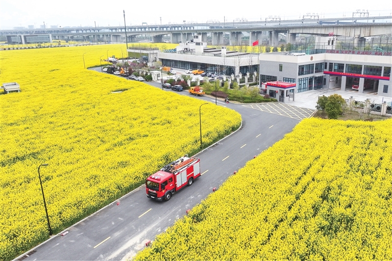 每当消防车从花海中开出来,红色的车身配着黄色的油菜花,撞在一起,格外显眼。
