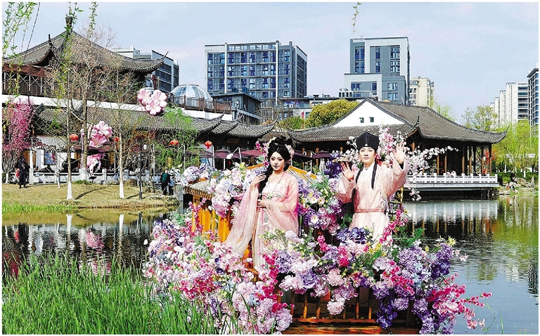 日前,上城区丁兰街道的千桃园景区里,30余个品种的7000多株桃树进入盛花期,每天吸引不少市民游客前来“赴千桃之约,悟孝善初心”;而在与千桃园相距约4公里的桃花湖公园里,1000余株桃树也花开正艳,还有衣袂飘飘的“花神”在湖上泛舟、花间巡游;就连串联起这两处观桃美地的华鹤街、临丁路沿线及上塘河沿岸,也都被盛开的桃花、樱花、海棠花等一路相拥,宛如在皋亭山脚下铺展出一幅绵延十里的江南春日画卷。