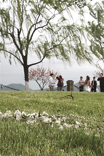 图为昨日,西湖白堤的草地上,不少飘絮飘落在地。