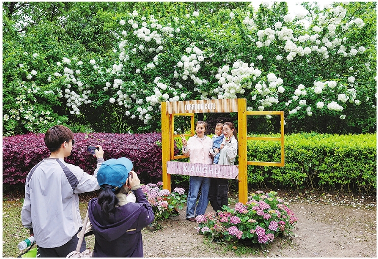 近日,湘湖窑影桥停车场旁,“湘遇绣球·花漾叠影”主题场景吸引了众多游客与摄影爱好者。20米长的大花绣球花墙沿道铺开,粉、蓝、紫三色花朵交织错落,高大的白木绣球与其背后的粉樱相映成趣,层次丰富。游客纷纷举起手机定格这份春日浪漫。据悉,该景观免费开放,花期预计持续至“五一”假期结束。