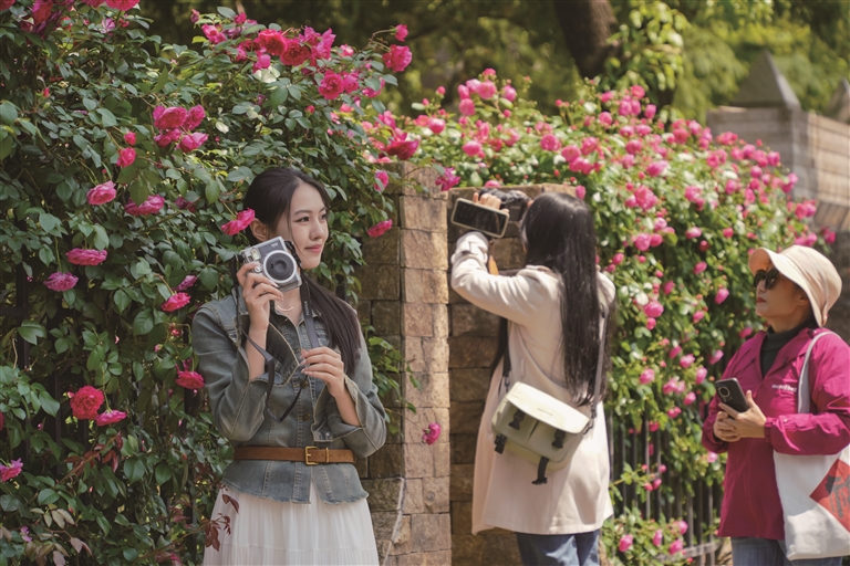 眼下,杭州大关公园的月季进入最佳观赏期。 公园外的百米围栏上,缀满层层叠叠的月季,粉的娇柔、红的热烈、黄的明媚,织就一片绚烂花墙,吸引不少路人驻足拍照,记录春日惊喜。公园内,月季拱门长廊、月季花墙,还有被月季环绕的花座椅,一步一景,步步生花,让人沉醉不已。 据了解,大关公园种植有25000多株月季,拥有树状、丰花、微型、藤本、大花月季等各类月季品种。图为昨天市民在大关公园打卡月季美景。