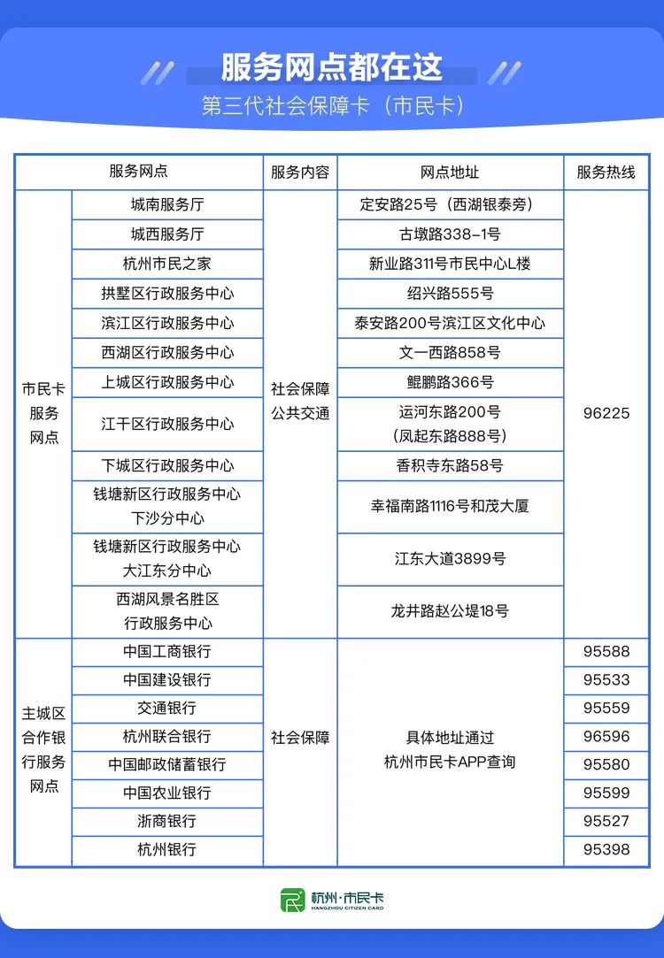 在原有杭州及区县市民卡服务网点的基础上,合作银行服务网点增至400余个,为市民提供更多选择。主城区首批上线银行:杭州联合银行、中国农业银行、杭州银行、中国工商银行、中国邮政储蓄银行、中国建设银行、交通银行、浙商银行。 后续还会有招商银行、广发银行陆续上线。