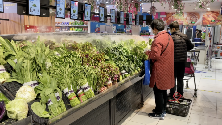 中午12点多,记者来到莫干山路旁一家大型超市,看到果蔬区域上的货架上,摆放着各类蔬菜,有些卖得好的蔬菜稍微空了点,售货员正在往货架上补货。
