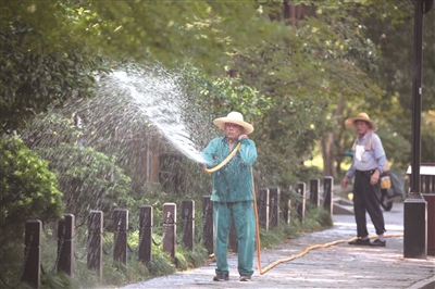 为给植物浇水,工人师傅们接起100米的水管从西湖抽水,又拉着水管浇水,不一会儿满身大汗。 记者 夏阳 摄