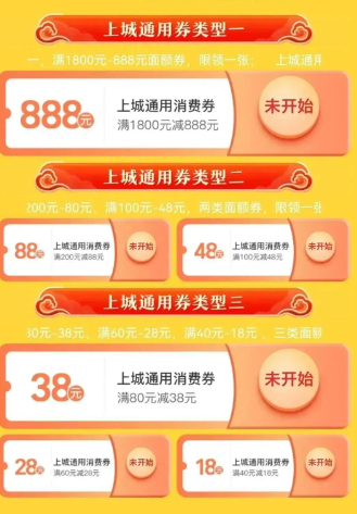 消费券面额设定为满1800元减888元、满200元减88元、满100元减48元、满80元减38元、满60元减28元、40元减18元,随机抽取。
