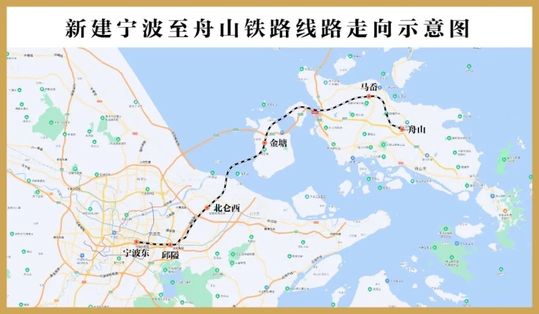 甬舟铁路西起宁波东站,经宁波市鄞州区、北仑区,舟山市金塘岛、册子岛及舟山本岛,东至舟山市定海区白泉镇,线路全长约77公里,设计时速250公里,是构建浙江省“1小时交通圈”、形成大陆与舟山岛间便捷客运的通道。