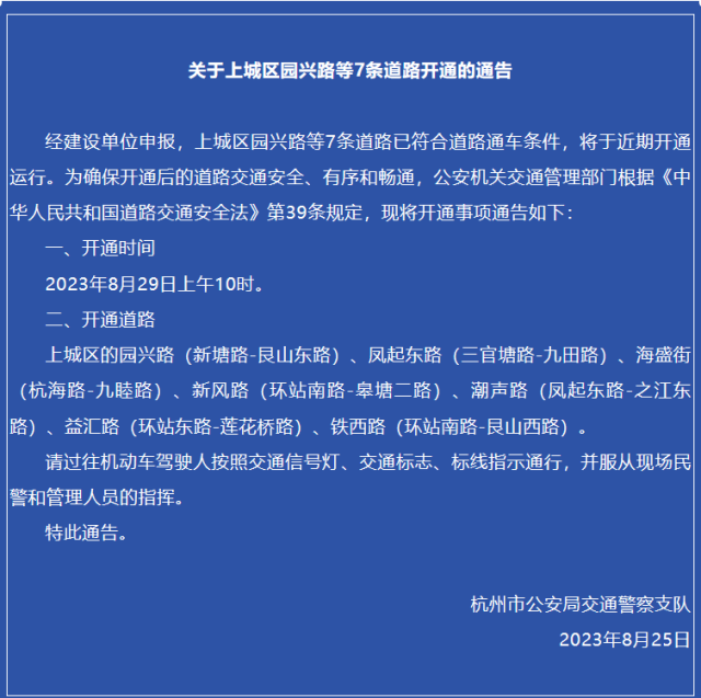 杭州交警发布消息,这些道路明起开通:
