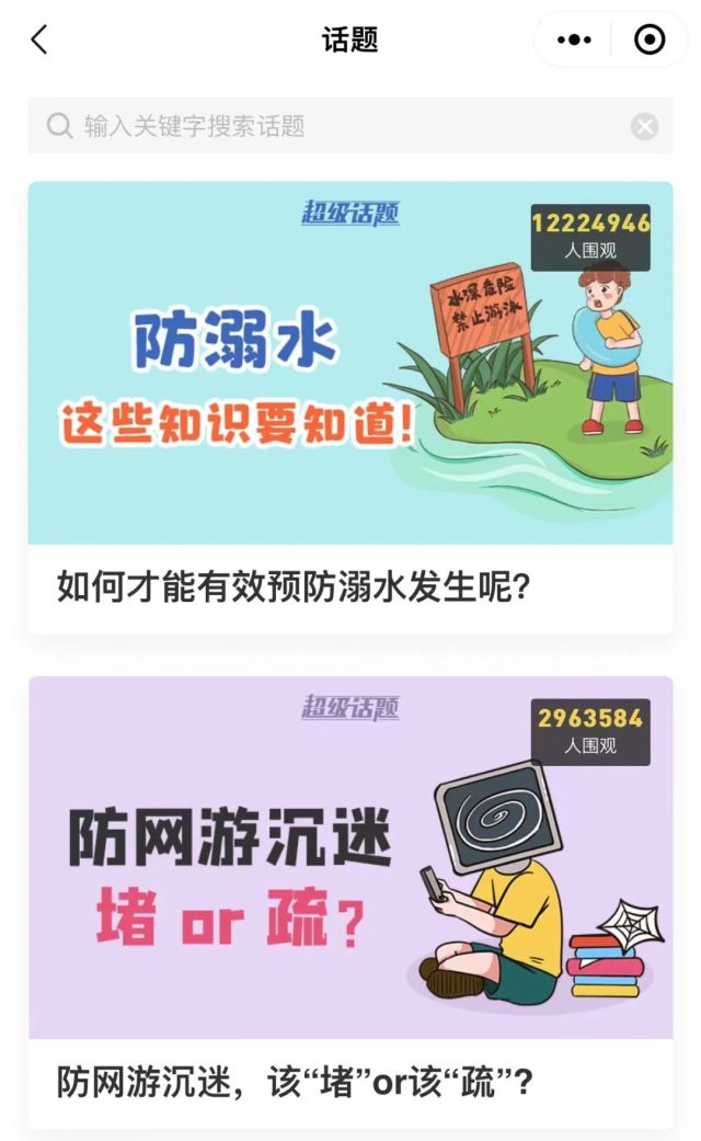 登录该平台,里面关于安全学习的内容有不少,比如防溺水、防网络沉迷、防诈骗等主题。仅防网络沉迷话题,围观人数达到296万人次。