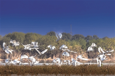 老郑介绍,那是白琵鹭,杭州的“常客”,嘴巴像一把琵琶,很好辨认。每年秋冬季节,它们都会成群迁徙过来。近年来,光顾湿地的白琵鹭是越来越多了。