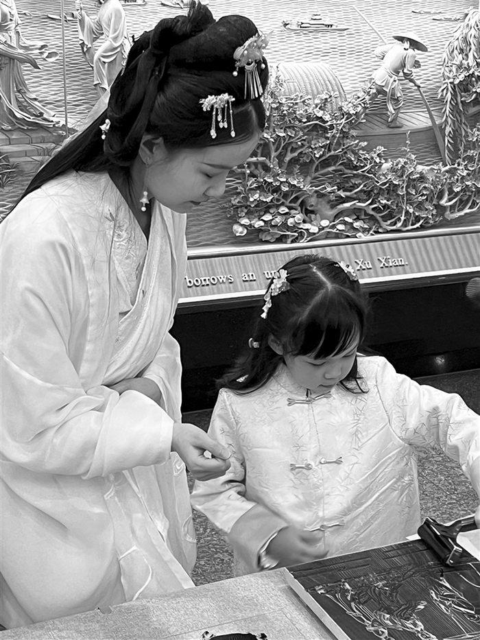 图为小朋友在“白娘子”的指导下体验“木刻拓印”。 据了解,本月的每周三和周四上午9:30-10:30都会举行活动,感兴趣的朋友可以通过网上微信公众号“雷峰塔景区”或者现场报名参加。