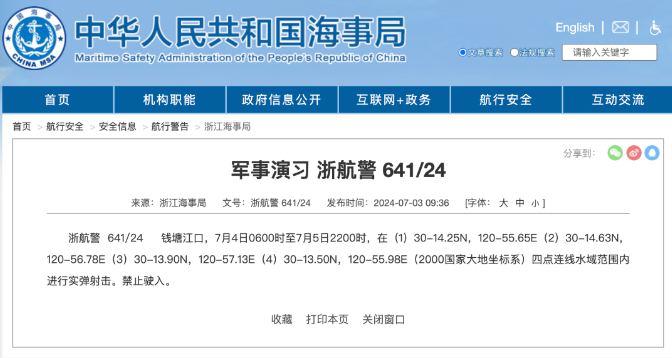 据中国海事局网站消息,浙江海事局发布航行警告,7月4日6时至7月5日22时,在钱塘江口四点连线水域范围内进行实弹射击,禁止驶入。
