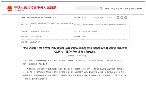 今年,工业和信息化部、公安部、自然资源部、住房和城乡建设部、交通运输部等五部门联合印发《关于开展智能网联汽车“车路云一体化”应用试点工作的通知》。