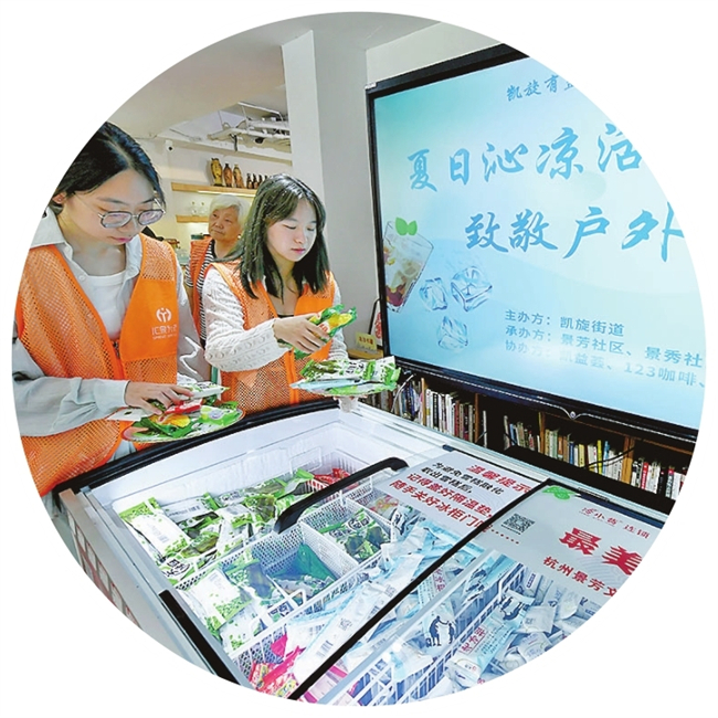 送清凉,自然也要走近“新”青年。“我听说,这里有免费的冰水可以拿啊?”外卖骑手周小哥有些踌躇地在西湖区求智社区“爱心水站”前张望。求智社区作为典型的老旧小区,大量快递员、外卖送餐员等新就业群体穿梭往来频繁,而且一到夏天,他们接单量更大了、劳动强度更高了、休憩时间更少了。“是的,您可以免费取用。”现场志愿者笑着说,“这里是我们专门为新就业群体设置的,希望能为你们带去一丝清凉。”外卖小哥接过冷饮后向志愿者道谢:“感觉一下子满血复活了!谢谢!”此外,社区志愿者还联合了新时代文明实践所为新就业群体送上凉扇,教一些简单的防暑小妙招,传递关爱。