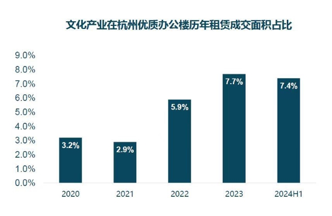 仲量联行数据显示,文化产业类企业在杭州优质办公楼历年租赁成交面积占比,呈现出逐渐上升的趋势。2020年还只有3.2%,2023年已经高达7.7%,而2024年仅上半年就已达到了7.4%。而这一数据还不包括办公园区,事实上,在租金更便宜的办公园区,文化类产业的占比会更高。