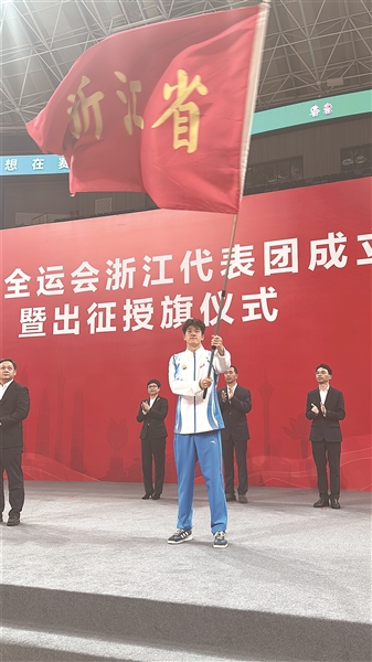 奥运冠军潘展乐挥舞浙江代表团旗帜