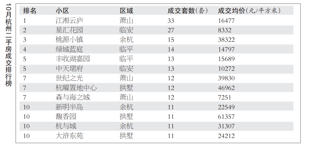 10月位列成交榜首的,依然是萧山南部卧城的拆迁安置房江湘云庐,成交了33套房源,环比上涨14%。成交均价16477元/平方米,环比同样上涨5%。