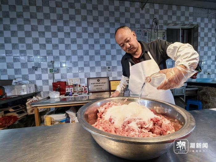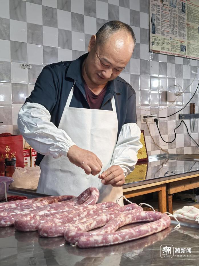 看着眼前的于师傅专注地将肉绞成粗细适中的肉丝,随后往肉里倒入白酒和各种调料,腌制半小时后,再将肉灌入肠衣中,最后打结、晾晒风干。二十多年过去了,一切仿佛都未曾改变。