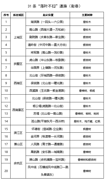即日起至12月31日,杭州31条道路(街巷)将采用灵活的环卫作业方式,开启“落叶不扫”模式。