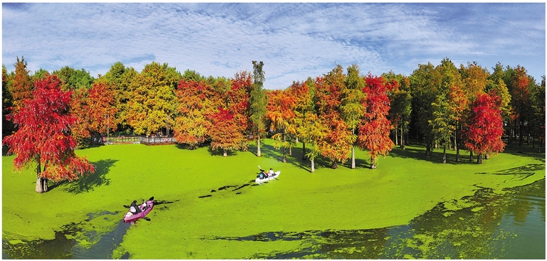 11月23日,临安区青山湖景区水上森林在初冬的阳光照射下,宛若打翻了调色盘,成为一处五彩斑斓的童话世界,吸引各地游客纷至沓来。这片位于青山湖北湖区的水上森林面积约5万平方米,生长着1万多棵池杉和落羽杉,大多杉树的根部常年浸入水下2米左右。水上森林的四季景色各有千秋,尤以冬初时节最为绚丽多彩。