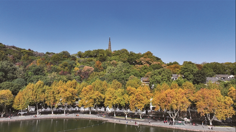 近日,杭州北山街的梧桐开始黄了。金黄和褐红的树叶交织,与西湖的碧水、青灰色的老建筑,共同构成了一幅绝佳的初冬画卷。