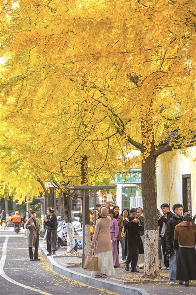 清吟街,市民在银杏树下打卡拍照。 记者 陈中秋 摄