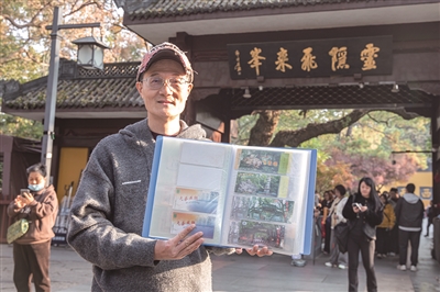 市民张逸闻带着多年收藏的灵隐飞来峰景区门票前来打卡