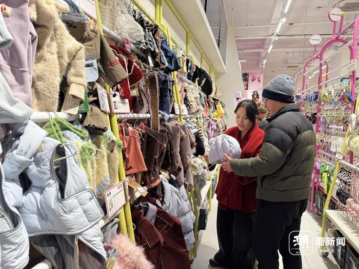 店员介绍,如今的宠物服饰越来越精细化,从基础的保暖功能延伸到时尚搭配、节日主题,还细分出防水冲锋衣、保暖羽绒服、喜庆新年装、小香风套装等。最近的天气下,厚实的宠物冬装卖得很好。