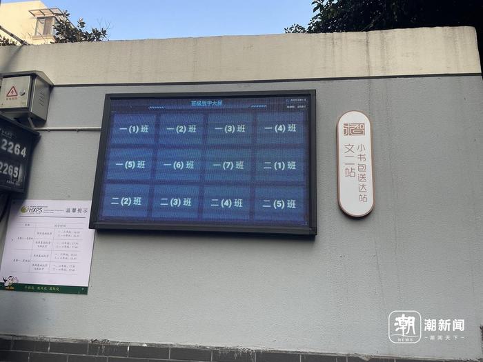 下午3点半,离校门口约100米的文二新村小区内,新安装的智能信息屏已经亮起,每个班级的方块都显示蓝色未放学状态。