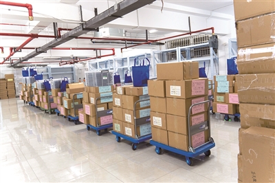 6:15,两位值班人员刷脸认证后,试卷保密室的门开了。这是一个空旷的房间,墙壁上装满了置物架,中间的空地上,排列着十几辆蓝色小推车,装着要送往各个考点的考试物品:密封的大纸箱,装着当天的试卷;透明收纳盒装着手持金属探测仪,是检查考生进场时要用的;蓝色袋子装着监考老师要用的拆封设备、纸笔、胶带等。